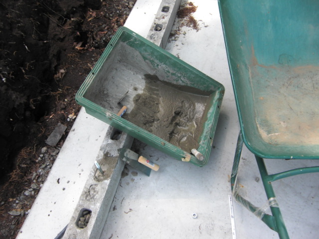 ブロックの基礎はプロにお願いしたのですが、ブロックの穴に生コンが入っていない箇所が多いのです。強度的には問題がないとのことです。しかし、水がたまるとの話もありますのでセメントで蓋をします。セメントの節約の為にバラスを穴の中に入れて、それからセメントわ詰めます。