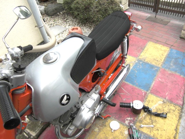 キャブを再組立、バッテリーを搭載。 キーON ! ??? ニュートラルランプが点灯しません。 チェンジをガチャガチャしたり、後輪を手回しして、ニュートラル を確認。 キーをガチャガチャ回すと、点灯したりしなかったり・・。 さらにキーをⅠ~Ⅴの間を行きつ戻りつすると正常に点灯す るようになりました。キーアッセンブーリーの接点か?。 でもこのキー新品に替えたばかりなのでそれはないと思いますが・・症状からみると接点不良くさいのですが・・。 セルスイッチ ON! ・・・・・・・・・・ ウンともスンとも言いません。 それはそうとして、キック!2回で始動です。 ただ、アイドリングが電波の波形のように波打ちます(回転が上がったり、下がったり) まず電気系統のトラブルシューティング。 バッテリー→マグネチックスイッチ=導通OK マグネチックスイッチ→スターター=導通OK マグネチックスイッチ~スタータースイッチ=??? 今日はここまで。所用のため時間切れ。 久々にCB92を引っ張り出してみました。 |
