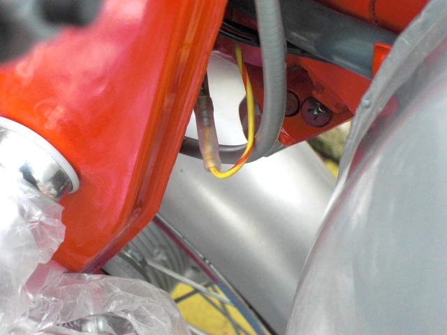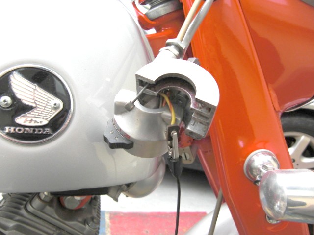 導通不良個所 発見! マグネチックスイッチ→スタータースイッチ間の黄色/赤スパイラルコードの、この部分が接触不良でした。 スタータースイッチ、ON! スターター回ります。 だだ、ほぼ掛かりませんけどね・・・。 で、キックで始動。ひとっ走り、いつものテストコースで・・・。 アイドリングの波うちもなくなっています。安堵して帰宅し、 スターター回るかな?とイグニッションキーを回すと、ニュートラルランプが点灯しません。今度はキーポジションをアチコチ回しても、ニュートラルランプは点灯しません。コンビネーションスイッチからの配線をたどっていくと、ヒューズが切れています。 思えば、この二つの接触不良が原因だったみたいです。 ヒューズを溶断させた原因と思いつくのは、充電しながらしつこくセルを回し過ぎたことぐらいです。在庫のヒューズに替えると 3秒間のセル回転を何回も繰り返してもヒューズが飛ぶことはありません。 ここからが ・・・ 問題です。 キック1発ではありませんが、キック3発内で確実にエンジンは 始動します。 だけど、セルの始動が困難なのです。 たま~に掛かるのですけどね・・・・・。 セルスタータースイッチを押すとニュートラルランプがグッと暗く なるところから見ると、電流がスターターに喰われて、プラグに 十分に回っていない感じなのです。(素人考え) 6Vのままで、セルスタートを容易にする、何かいい考えが無いでしょうか?