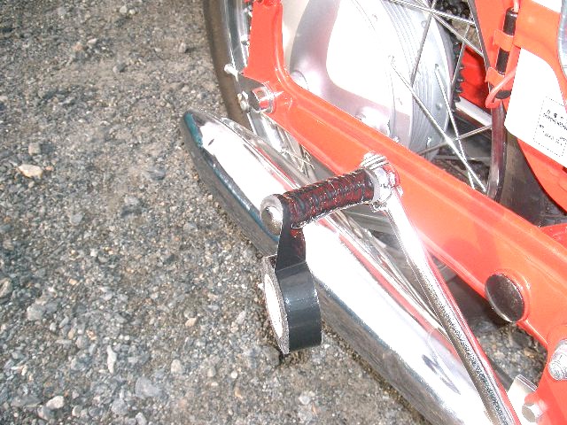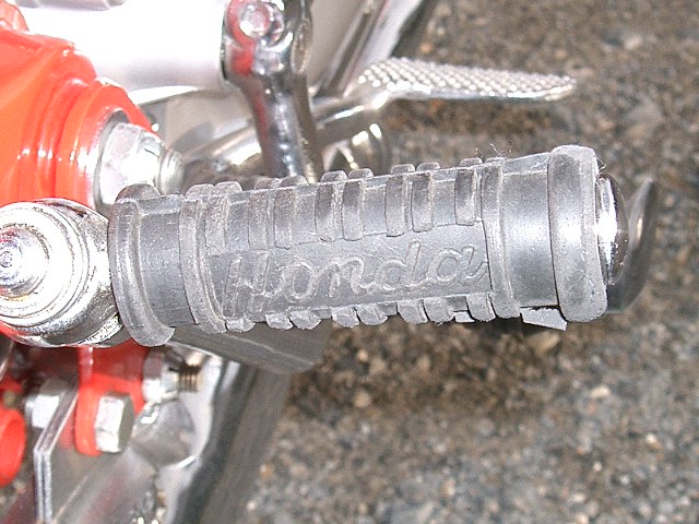 で、見るともなく見てしまったのです。ギャー!。涙・・・涙・・・ キックのラバーが裂けているのです。 M野さんから譲っていただいた貴重な、ロゴ入りの当時物です。動揺。 目を近づけてよく見ると、そうとうチビています。これだけキックしたわけです。 反対側にはしっかりHONDAのロゴが残っている。 とりあえずビニールテープをグルグル巻きしておこう。 そして、これからはセルによる始動を試みることにします。当初はセルではなかなか掛からなかったのですが、近頃はなぜか掛かる確率が高いのです。 まだ走行試験中なのですが、近頃2速から3速に入れるとき、ニュートラル状態、空転状態になり、もう一度入れなおすと3速に入ることがあります。こういうことは、よくあることなのでしょうか?。 PR