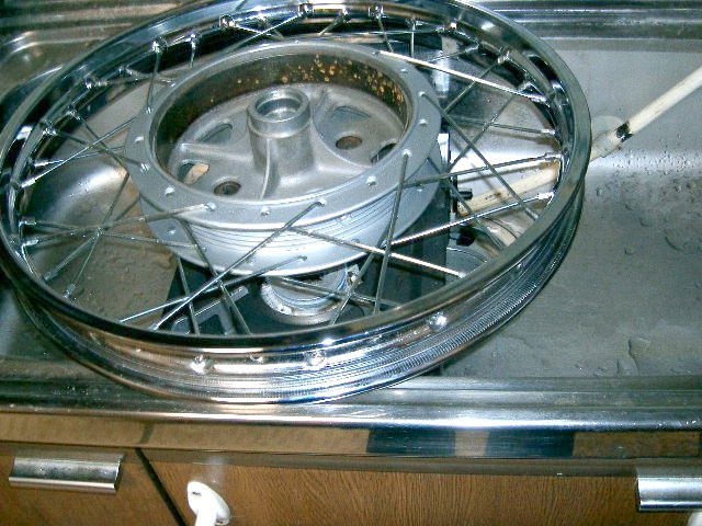 ②シンクの下に携帯コンロを置き、リヤハブをぬくめ