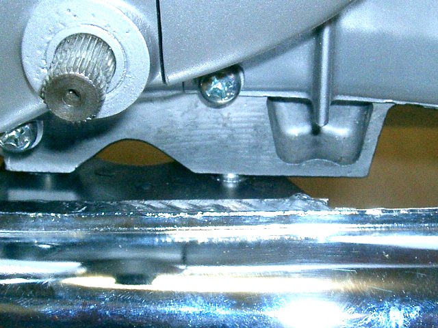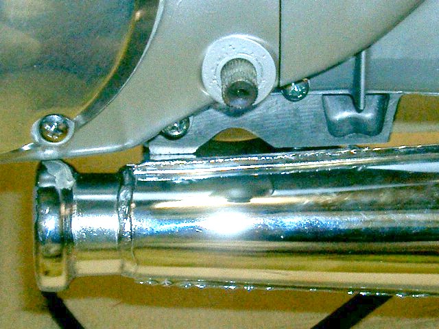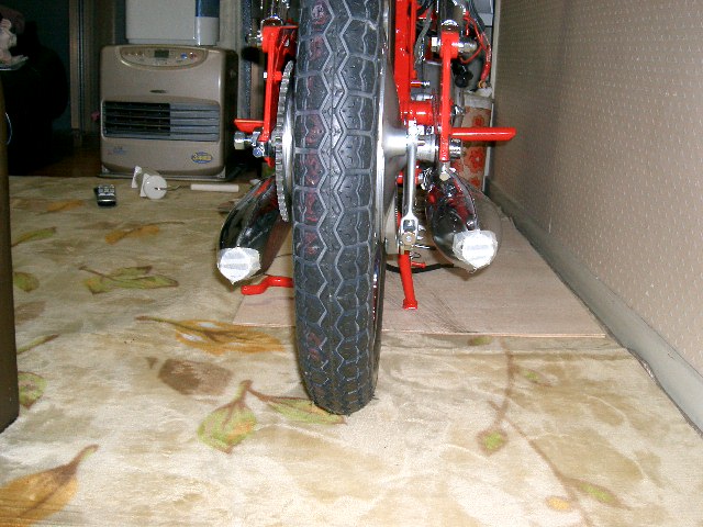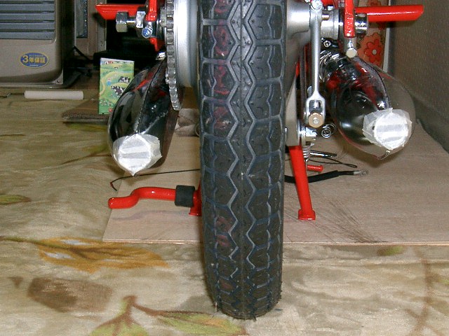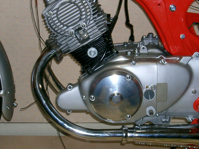 ロムラーさん、マフラーの断面形状は左右で違います。左側はチェーン機構に干渉しないように、半円状になっています。たぶん、これはこれでオリジナルだと思います。