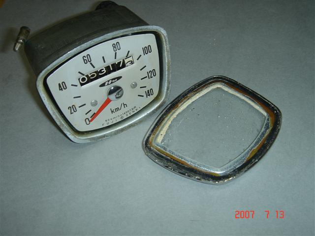 このメーターのガラス周りにもられたパテをみるとこのままにしておけません。カシメあとがギザギサになるのを覚悟して、こんなこと、あんなことをしてガラス枠をはずしました。ふぅ~。