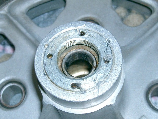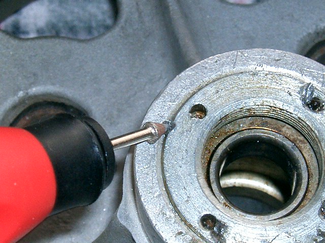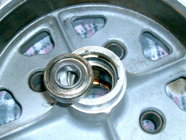 私ときたら、ドライバーで「ためらい撃」を何度も加えてしまい下の写真のように「切られのよさ」です。おまけに回りません。 しかしこの「一撃」が出来るかどうかがプロと素人の違いだと思います。アマチュアは中々この一撃が出来ないのです。 ハブとリテーナーの間に割り印のようにポンチ跡があります。このカシメが効いていて回らないのかと思い、リューターで気長に削ってやりました。 その後、やけくその一撃でやっと回って、外れました。 勿論ベアリングも外しました。 PR