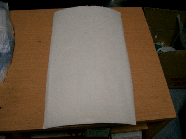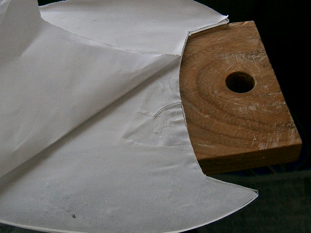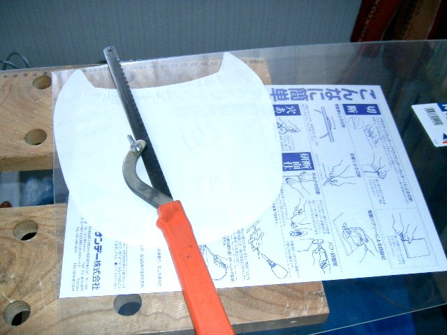 見本のウインドシールドをお借りできたので、まず、紙型を2枚作りアクリルの表裏に貼り(アクリルの傷つき防止もかねて)切り出します。勿論、もっと細い糸鋸やジグソーの方がいいのにきまってますが・・。