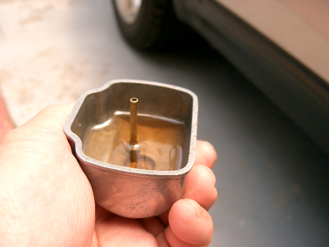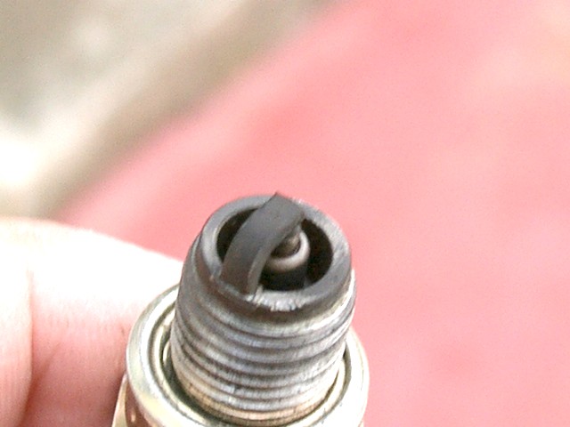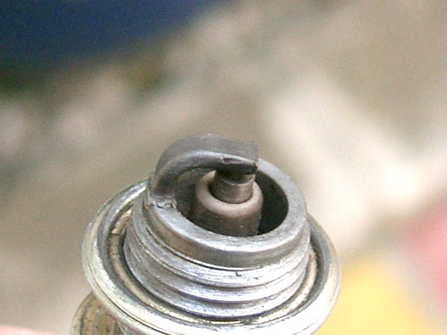 さて、72さん、どっかから空気が流入しているという素人には発見しずらい原因はお手上げなので、 やはり、火花、混合気、圧縮のどれかが不十分と仮定して原因究明をしたいと思います。 プラグの状況は下の写真の通りです。 これは左側ですが、カーボンが付着しています。 ↓右側はカーボーンが付着しておらず、ほぼ差し込む前と同じです。 この後、シリンダーに付け火花試験をするのですが、最初は火花が見えるのですが、2度3度すると、火花がみえなくなります。バッテリーが弱ってきたのでしょうか。 取り扱い説明書に標準プラグは「D8H」となっていましたので、コーナンに買いに行ったのですが、やたらと記号が長くなっていて、D8Eなんたらかんたらと云うプラグがあったのですが、判断が付かず買わずにかえりました。D8で兎に角ネジは合うようですので、明日は購入し、バッテリーも充電して10キックだけやろうと思います。 次は混合気です。フロートチャンバーを静からとりはずして油面をみると、イイアンバイに思えます。 キヤブクリーナーであらゆる穴をシュ、シュと吹いてやりました。詰まりはありません。ただ、エアースクリューの先端が、ちょん切られたようです。これって正常なのでしょうか? 懐中電灯を利用して、点火時期点検をしました。クランクを時計回りにまわして、合いマークFがきたら点灯します。従って点火時期はあっていると思います。 キックでの始動、出来ませんでした。パーンと弾けるような一発はあるのですが、その後は、それさえ忘れたかのようにスカキックです。 |