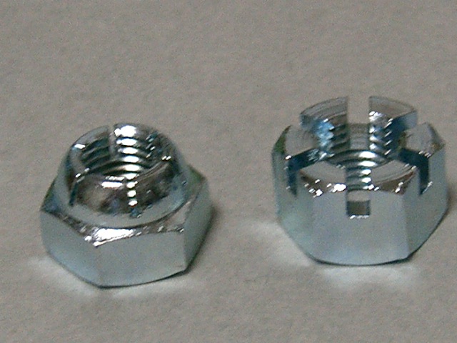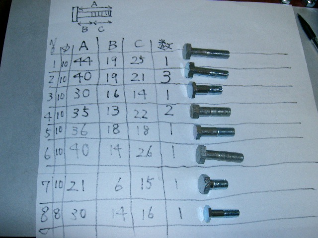 キャスルナット、セルフロックナットは市販品であれば取り寄せ可能とのことでした。と、云うことはどっかで市販しているのですね。 頭の薄いボルト(なにか頭の薄いなどと言うと自分の頭が気になるのですが)、インチサイズで似通ったものがあることが分かりました。 ボルトの方は、ネジ部を切ったり、頭を削ったり、ピン用の孔を開けたら加工できそうです。で、一つ一つやらずに、全パーツを仮組して、一度に作りたいと思います。 で、ありますので明日から他の作業をすることにします。 そろそろ本組みをしたいのはやまやまですが、どうもボルト・ナットの関係が良く分かりません。そこで下の写真のような表を作ってみました。フリーハンドで見難いですが、拡大して見てくださいね。