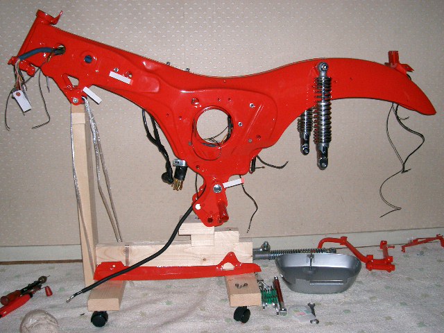 × [PR]上記の広告は3ヶ月以上新規記事投稿のないブログに表示されています。新しい記事を書く事で広告が消えます。 今日までの仮組み立ての経過です。パーツリストを頼りに仮組み立てをしているのですが、分からない事、疑問点が次々出てきます。区切りがついたら完成車を見せてもらう予定ですが、このブログで分かったら教えて下さい。まずは次に続きます。 リアーフォークピポットボルトです。ワッシャー→ステップアーム→リアフォークと繫がりますが、ステップアームとリアフォークの間にはワッシャーはいらないのでしょうか?(パーツリストには書いてありませんが) リアーフォークピポットボルトの最終端です。パーツリストには「セルフロックナット」と書いてありまかすが、これでいいのでしょうか? リヤークッションラバーブッシュです。ゴムとは思えないほど硬化しています。おまけに1ケ欠けがありますが、ホンダにもCMSにもありませんのでこのまま使用します。リヤークッション上部をとめる袋ナットですが、パーツリスト通りの品番のものを付けました。しかし、一寸小さいような気がするのです。もう一回り大きい袋ナットが似合うと思うのですが、皆さんのCBはどうでしょうか? 下部のボルトもどれか分かりません。半ネジボルトが使われていますが、ネジの切られてない部分の長さは実測したら分かりますが、雑誌「バイクステーション」に写真が掲載されているCB92は、あまったネジ部を袋ナットで化粧しています。オリジナルはどうなんでしょう? チェーンアジャスターの大きさが違いますね。これはどう云う意味なんでしょうか? 一応仮組みしましたが・・。全く自信ありません。 パーツリストにはフェールタンク取り付けステーの取り付けボルトの記載がありません。6×8ノボルトで問題はないと思うのですが。もう少し長いほうがよいかも。 クラッチワイヤーです。写真には写っていませんが、破けがあるらしく2ケ所ビニールテープが巻いてあります。ワイヤー類は新しくしたいのでオークションをウオッチしています。 クラッチワイヤーの取り回しはこれでいいのでしょうか? これからの作業のため、と言うよりか7ミリのコードに内径7ミリのゴムパイプは挿入できないことが判明して(笑い)嫌々買い物に行った往復32キロのガソリン代と3時間をムダにしてしまいました。全部の材料を買うために三件のホームセンターを廻らなければなりませんでした。一軒の店では揃わなくなりましたね。それと、「ゴムパイプはどこにありますか?」と店員に聞いたら「ゴムパイプってどんなものですか?」 と聞き返されました。あらゆる意味で日本はもう終わりではないでしょうか? 写真①イグニッションコイルとプラグコード及びキャップです。不具合点は防振用のゴムパイプが一つはなくなり、一つは破けています。でこのゴムパイプを買いに走っているのです。今ひとつは以前当ブログで紹介した通りプラグキャプの一部に割れがあります。 写真②すっかり忘れていたのですがCMSからCB92用のプラグキャップを買っていました。オリジナルとの比較です。形状が違いますね。それとコードに対するキャップの取り付け方法が違います。オリジナルはキャップの中からスクリューを差し込みます。新タイプは写真③のようにコードの差込ぐちにスクリューが切ってります。 沈思黙考。オリジナルを使用し、不具合がでたら新に帰ることにしました。あとでオリジナルのキャップの割れをパテで埋めたいと思います。 写真④これはスタータースイッチのコードですが、ゴムパイプを入れたいのですが金具が邪魔ではいりません。ゴムパイプをドライヤーで暖めて、金具に針金を通して引っ張って無理やり通しました。体力がいりました。フゥー。明日は組み込みです。 |