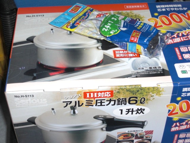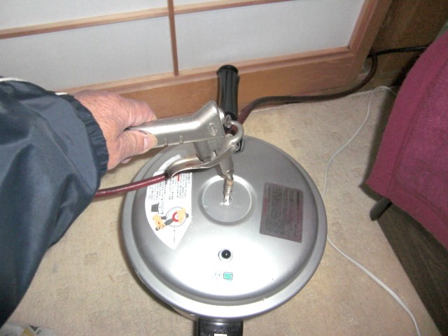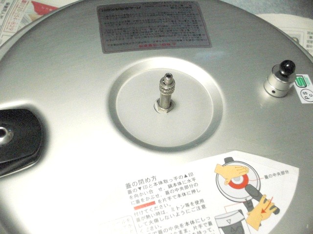 がピーと上がったので、圧力は掛かったと思います。今夜密かに圧力鍋を抱いて 風呂に入り、漏れがなかったら、ムシゴムを抜き、圧縮空気がまさしく入っていたこ とを確認したら、明日再再チャレンジです。 電池切れにつき、写真無しです。