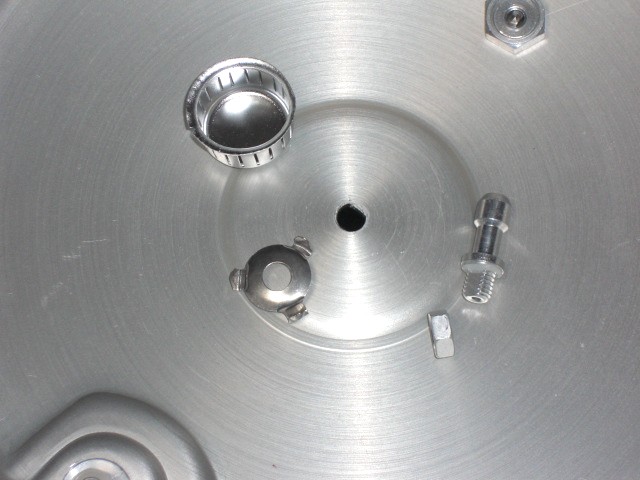 蓋の中心にある蒸気のがしノズルをとり、チューブのバルブに入れ替えるのが作業内容です。