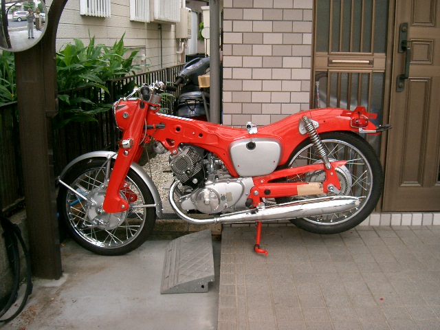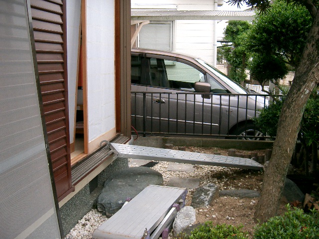 こうして、ああしてと構想を練りました。アミ戸を外し、ガラス戸を外し、写真に写っている障子も外して、娘と娘婿の力を借りて、CB92を屋外に出しました。