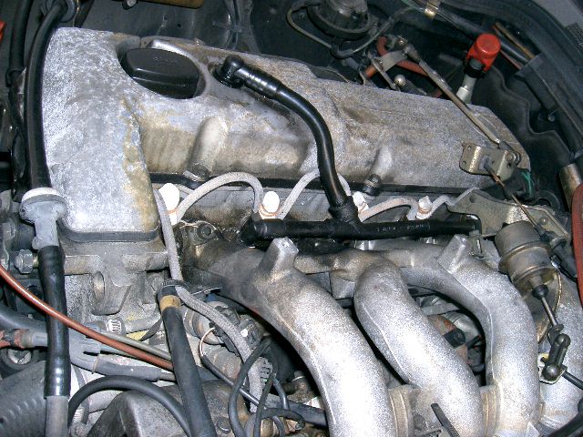 燃料ラインをはずした、これでなんとかインマニを外せそうですが、雪が降ってきたのでここので。白くみえるのは、作業用ゴム手袋の指先を切って、燃料パイプを外した後にゴミが入らぬよう蓋をしました。