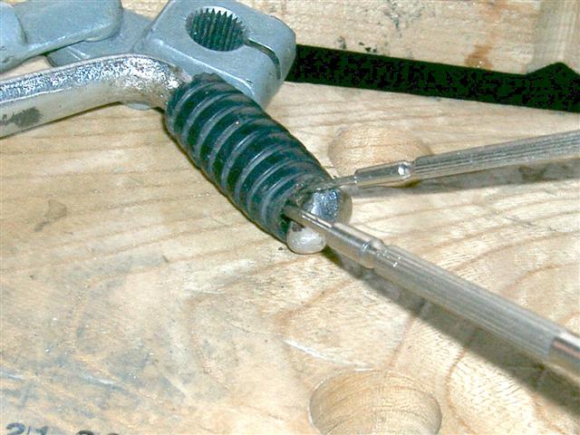 ところが写真②のゴムが抜けません。熱湯に漬けまくり、CRCを吹いたり、精密ドライバーでこじったり、フイルムをかましたりしましたが、かえりが深くゴムが硬化しておりどうしてもとれません。腕の筋肉がガクガクしています。いつまでもチョビチョビせずに明日には一気に再メッキの下準備を済ましたいので、思い切ってバッサリ切ってやります。切ってやりますとも。やるときはやるのです。モウカンベンナラナイ!