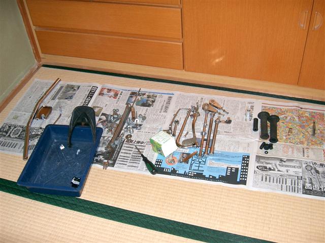 昨日までの作業の成果です。左の方から、交換する予定のパーツ、ユニクロメッキ予定、クロームメッキ予定、ゴム部品、清掃だけで再使用するパーツ、と分けているつもりですが、尚疑問点があるので後日クローズアップして質問する予定です。