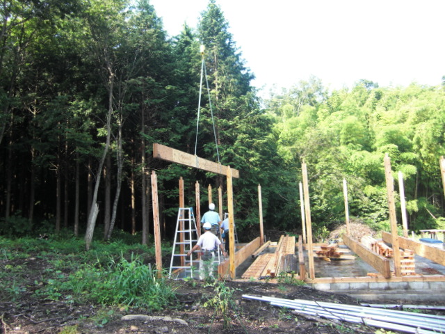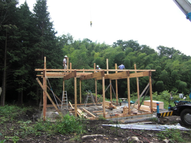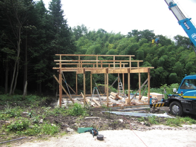 大工さん2名、見習い1名、クレーン1台で1日でここまで出来ました。
