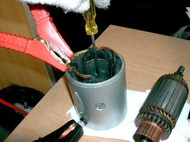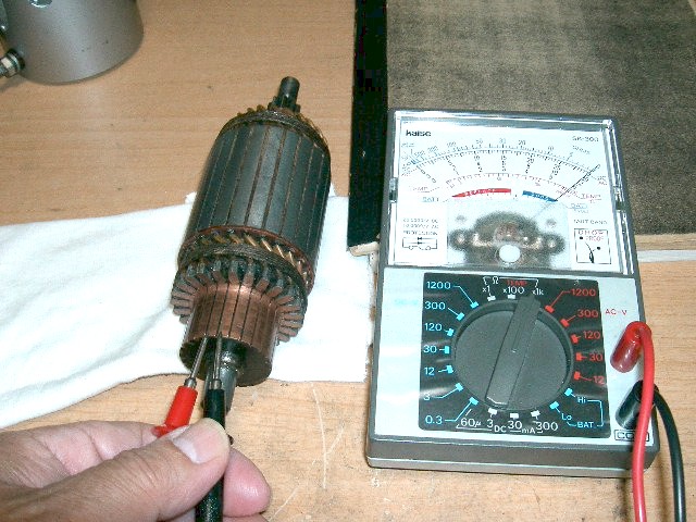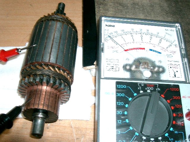 × [PR]上記の広告は3ヶ月以上新規記事投稿のないブログに表示されています。新しい記事を書く事で広告が消えます。 スターターですが12Vでビュンビュンまわりました。もちろん瞬間的です。 組み立てたスターターが6Vバッテリーを直結しても回らなかった。で自動車の12V を直結すると、ゆ~っ~く~り~とまわった。兎に角回りはしたのですが、これでは おかしい。そこでアーマチュアルコイルがどっかに引っかかっていないか点検した。 遊星歯車部分をつけないで回すとスムースに回転します。次に遊星歯車部分を付け スプロケットを握って回すとすごく重くなります。こんなものでしょうか? 次にテスターを使って点検します。 写真①スターターケーブルターミナル→カボーンブラシプラスターミナル=通電あり○ 写真②カーボーンブラシが当たるところを隣り合わせに全部点検=通電あり○ 溝の部分も隣り合わせに全部点検しましたがこれも通電ありでした。 写真③アーマチュアルコイルの絶縁テスト=絶縁あり○ 何故なんだろうか?? ペンディングです。 |